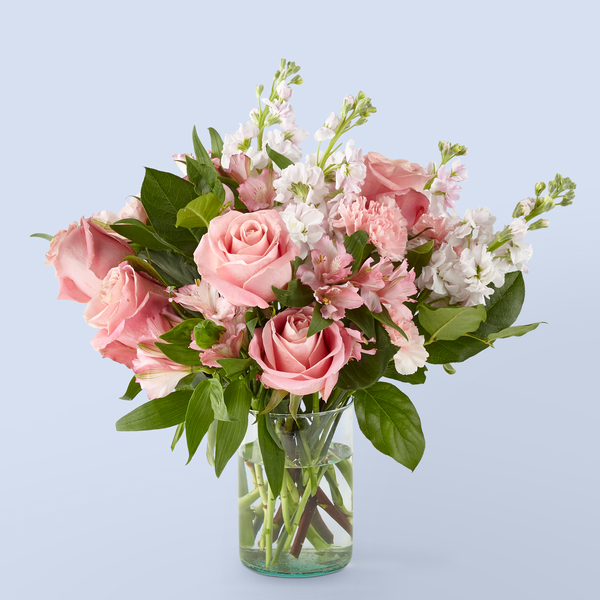 Un bouquet dans des tons roses, composé notamment d’œillets standards, de tiges d’alstroémères, de roses de 50 cm, de tiges...