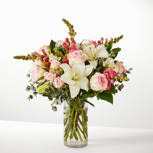 Un bouquet délicat aux teintes douces et romantiques. Les blancs purs se marient harmonieusement avec les roses tendres pour créer...