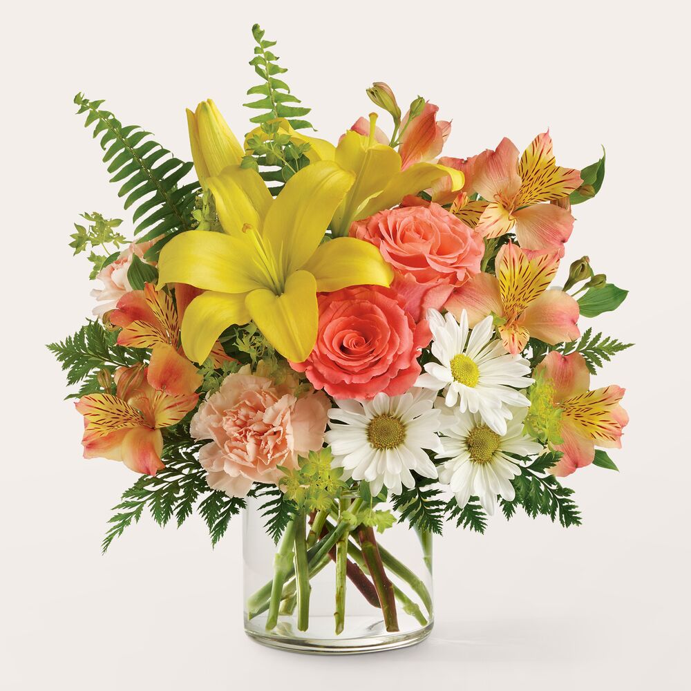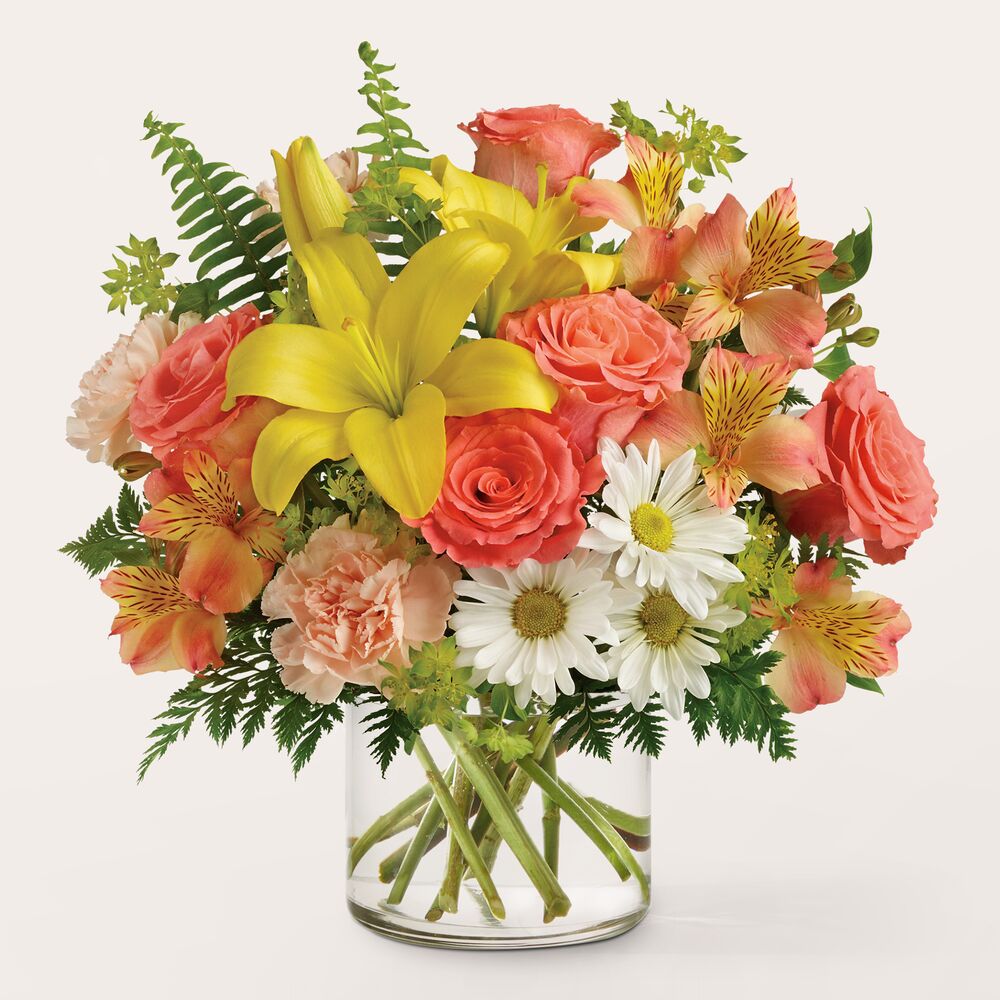 Un bouquet dans des tons orange, jaune, pêche et blanc, composé notamment de roses, asiatic lis, alstroémère, œillets standards, pompon...