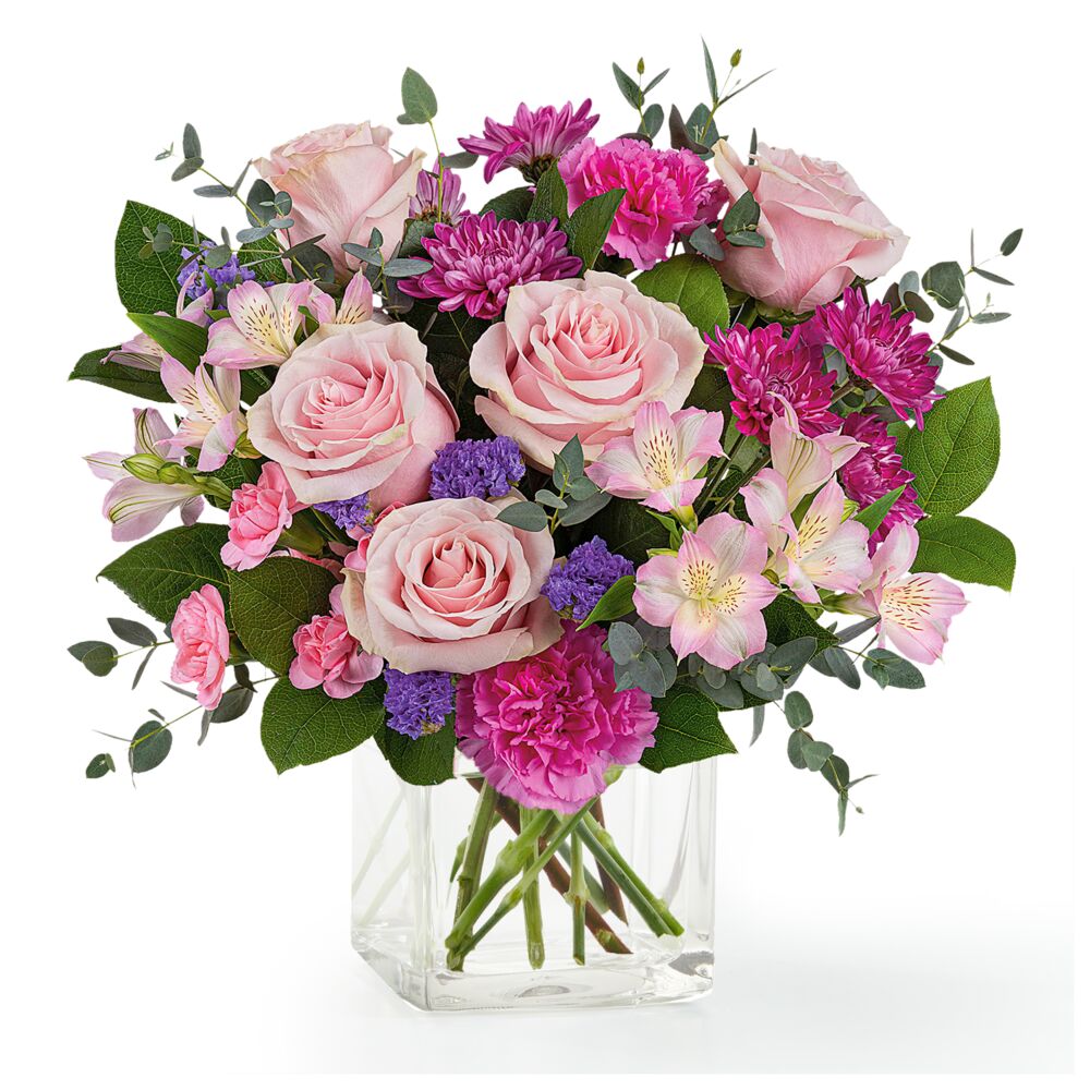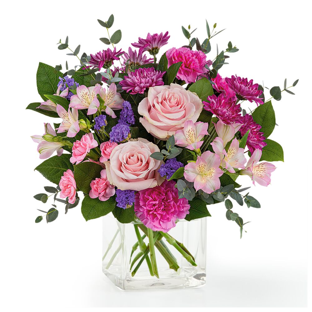 Un bouquet dans des tons rose, rose vif et violet, composé notamment de roses de 50 cm, de tiges d’alstroémères,...