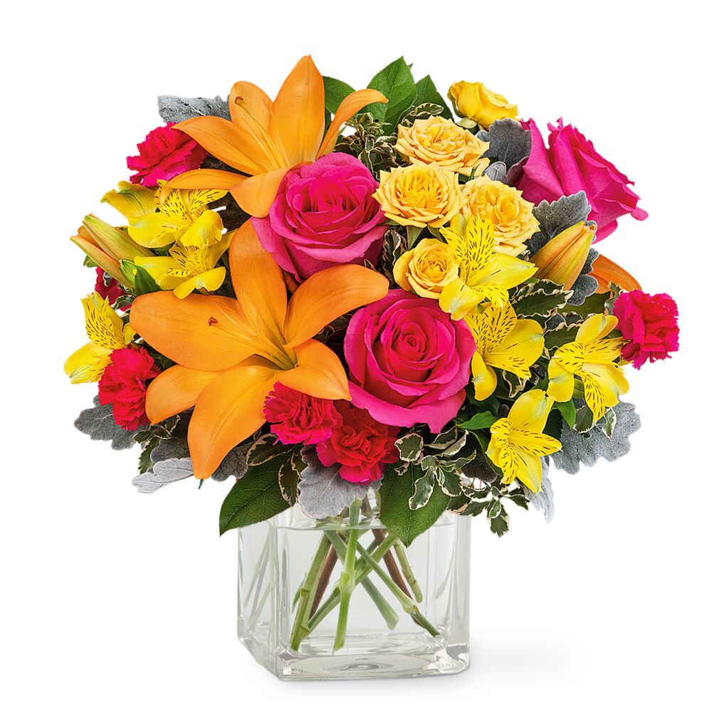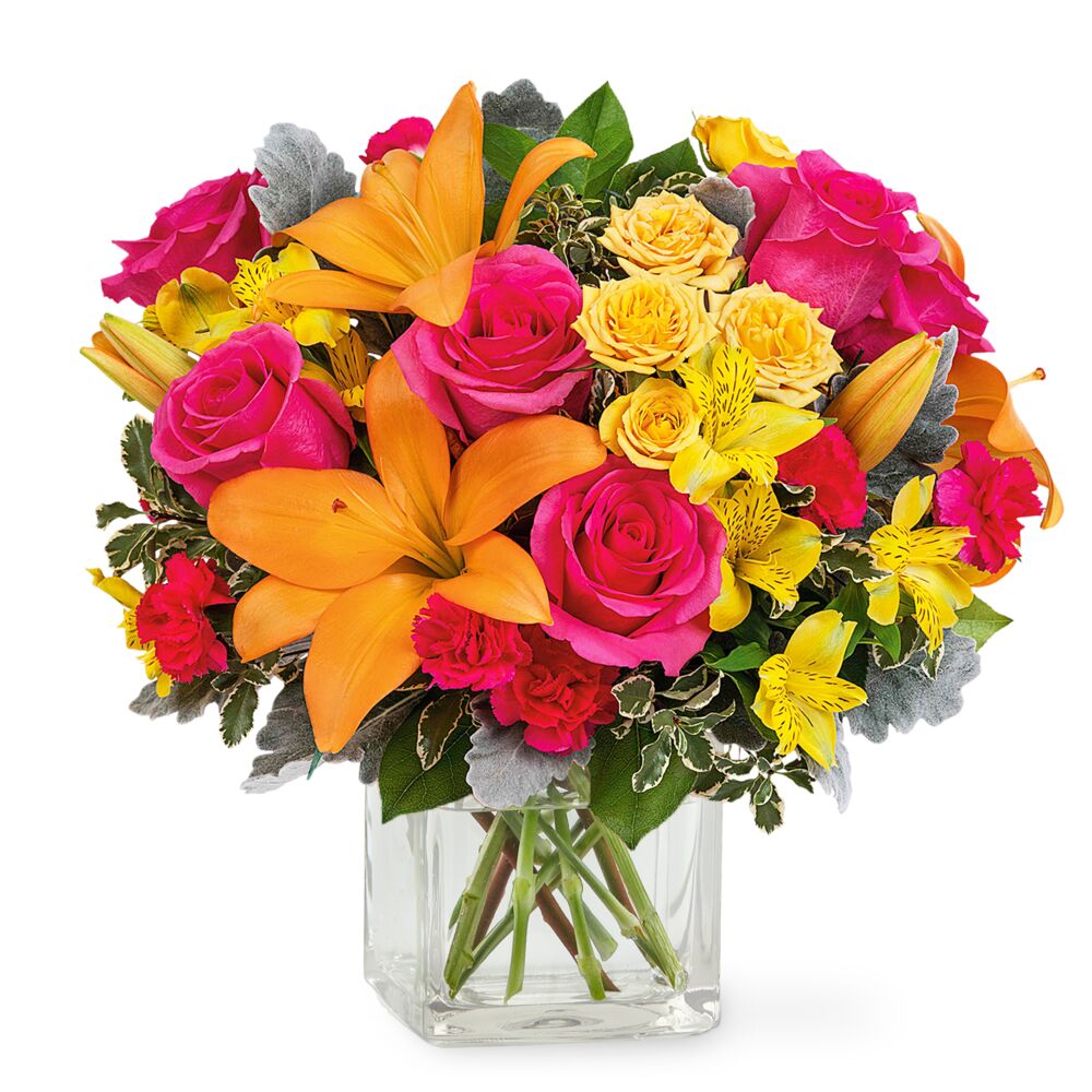 Un bouquet dans des tons rose vif, jaune et orange, composé notamment de roses, rosiers en spray, lis hydride, alstroémère,...