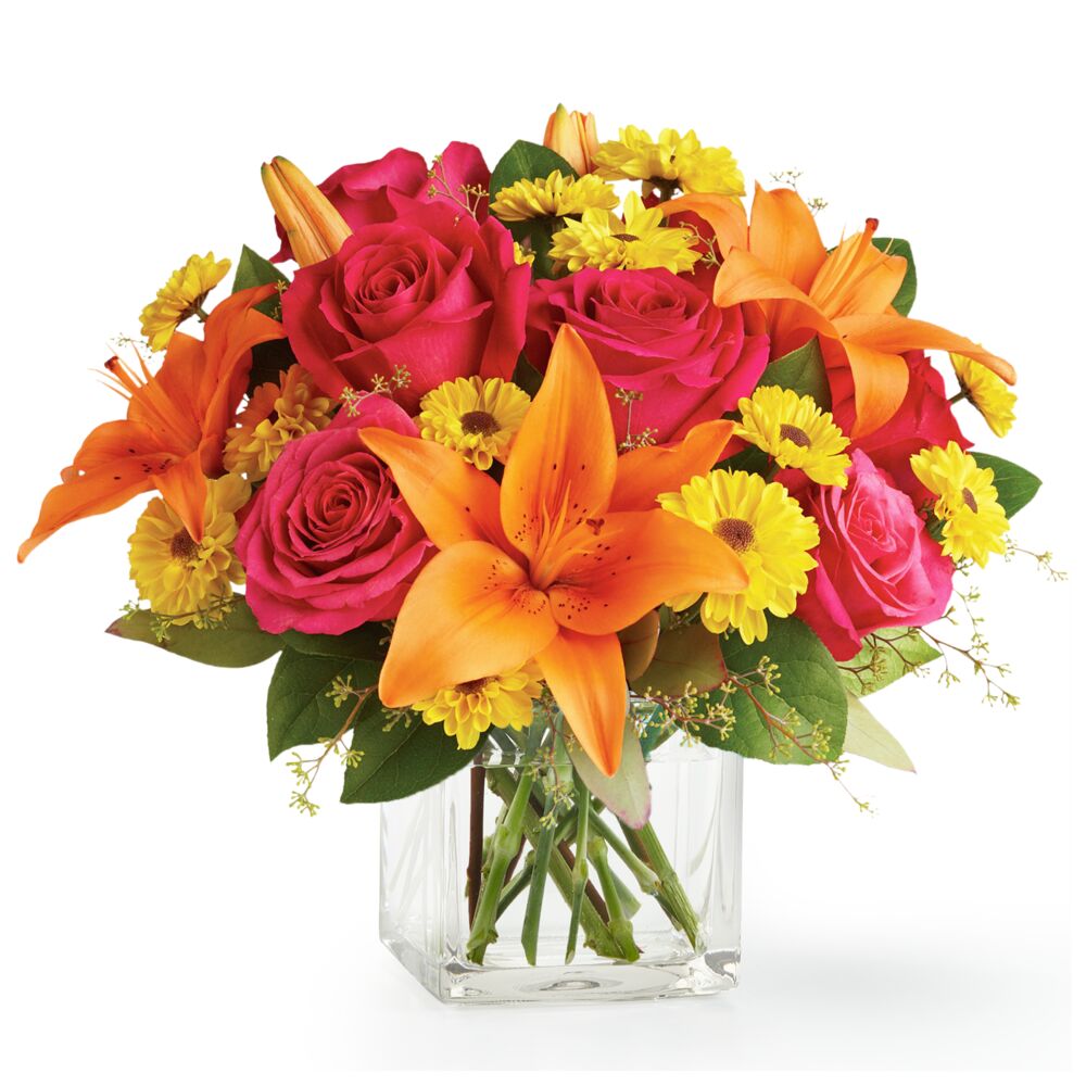 Un bouquet dans des tons orange, jaune et rose vif, composé notamment de tiges de lys asiatiques, de tiges de...