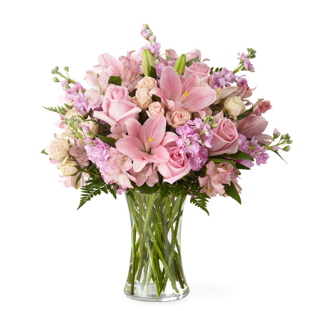 Un bouquet dans des tons rose, composé notamment de giroflée, alstroémère, roses, rosiers en spray, lis hydride et fougère cuir,...